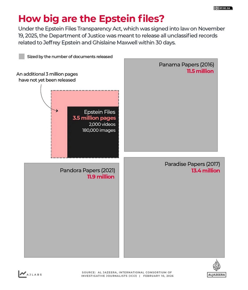 Queste sono le dimensioni degli Epstein files. Ma posso semplicemente trattarli come dei “big data” da mettere in correlazione per ricavarne più informazioni possibili? Ci rifletto nell’ultima newsletter tispiegoildato.substack…