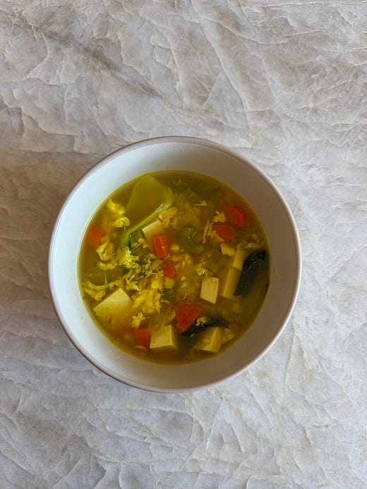 High-protein from the bone broth, tofu, and egg + anti-inflammatory ingredients. Turmeric for glowy skin… you know the vibes. Recipe posted on my page!