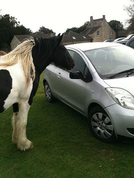 I asked this extremely diligent horse to guard my car and said I'd be back in "around 45 minutes". Ended up being gone a whole four hours. Didn't move from his post. Remarkable. What a guy