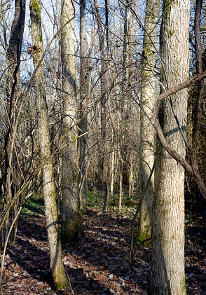 Photo: a young, vigorous stand of chinkapin oak and other trees ready for spring. Copyright Tom Kimmerer