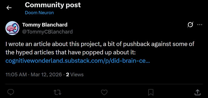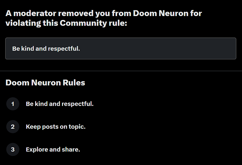 I tried to share this article with the “Doom Neuron” community (a community around the project I talk about in this article) and it removed within a minute, with the rule “Be Kind and Respectful” cited as the reason