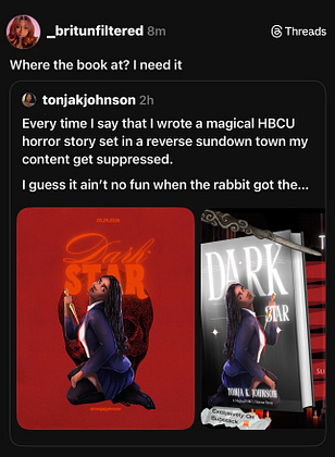 So one of my favorite booktokers shouted out my magical HBCU horror story set in a reverse sundown town. 👀