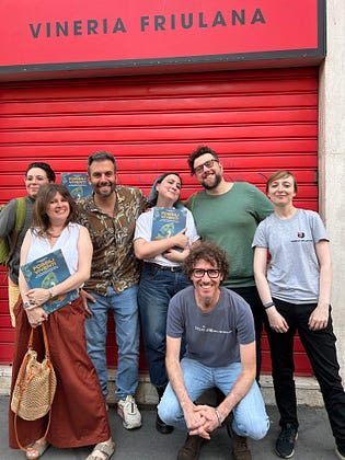 La presentazione di ieri è stata una gioia vera. Leonardo è stato l'interlocutore migliore possibile per Fossili Viventi, che ha colto lo spirito del libro nella sua serietà e nella sua stupidera. E nel pubblico un sacco di facce amiche unite dal fatto che ci piacciono le storie peculiari e sanno che si nascondono nei posti più impensati, (tipo davanti alla serranda di un vinaio friulano).