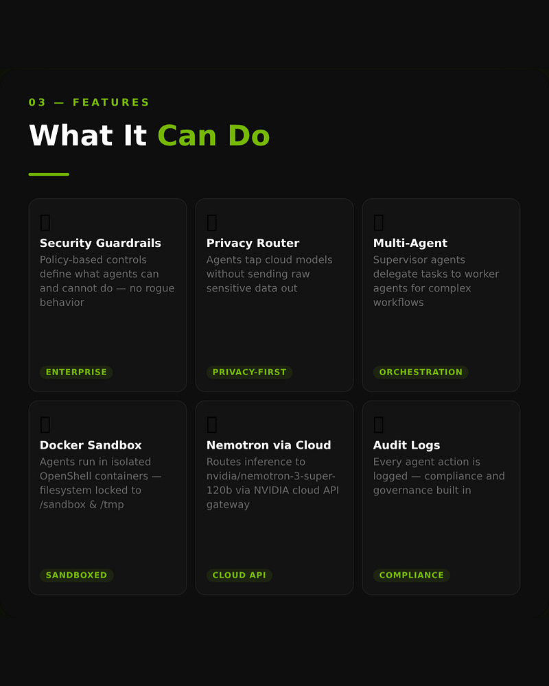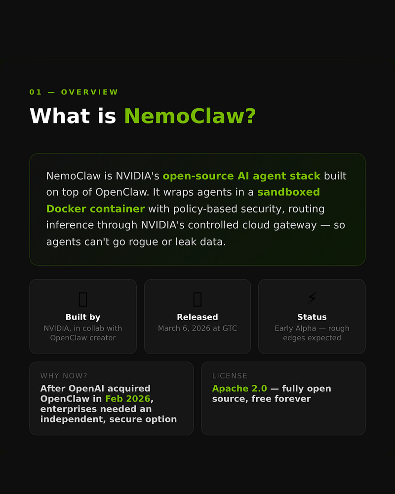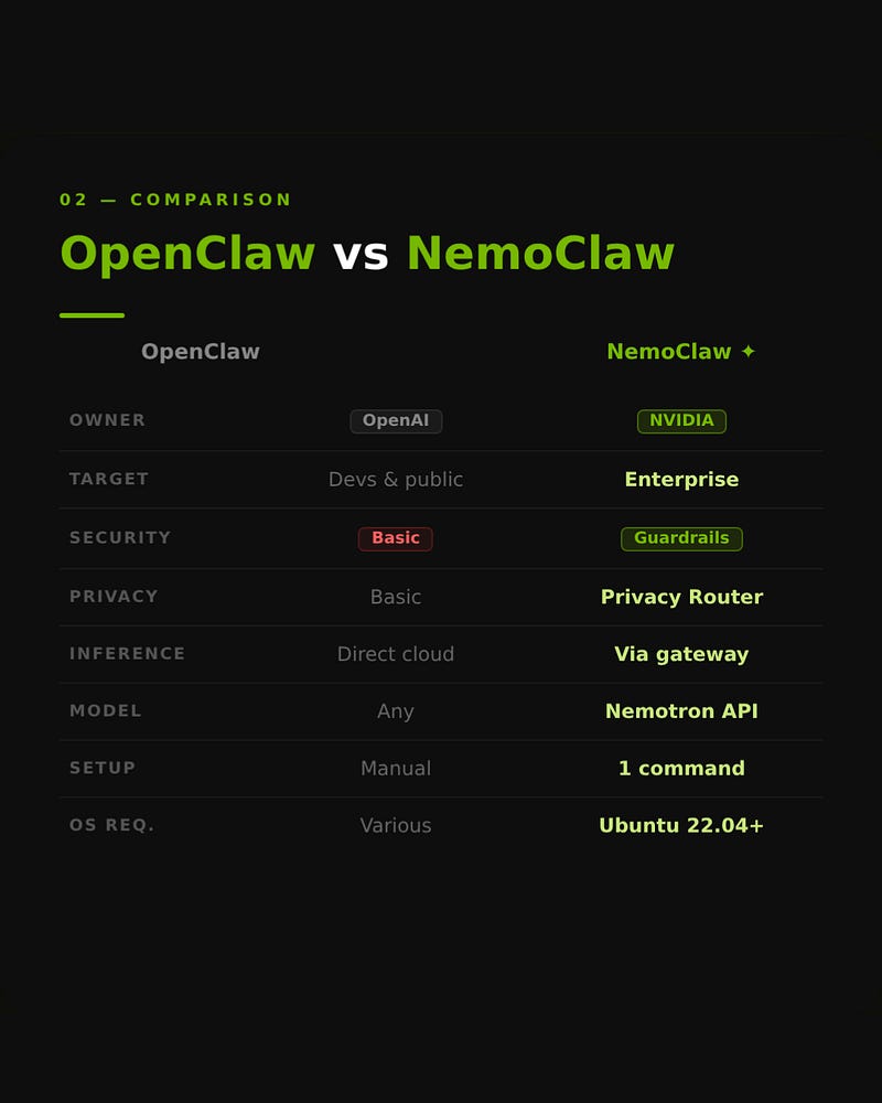 NemoClaw = OpenClaw + sandboxed execution + security guardrails + inference routed through NVIDIA's cloud gateway.
