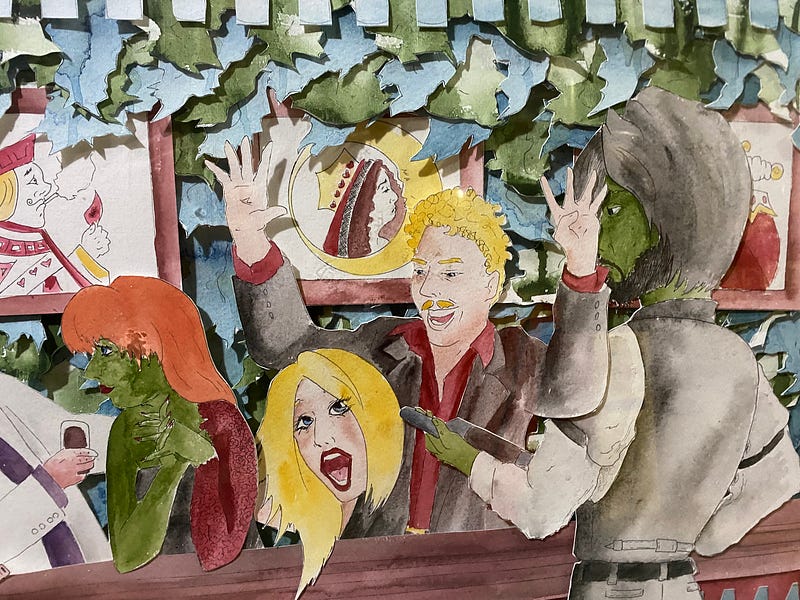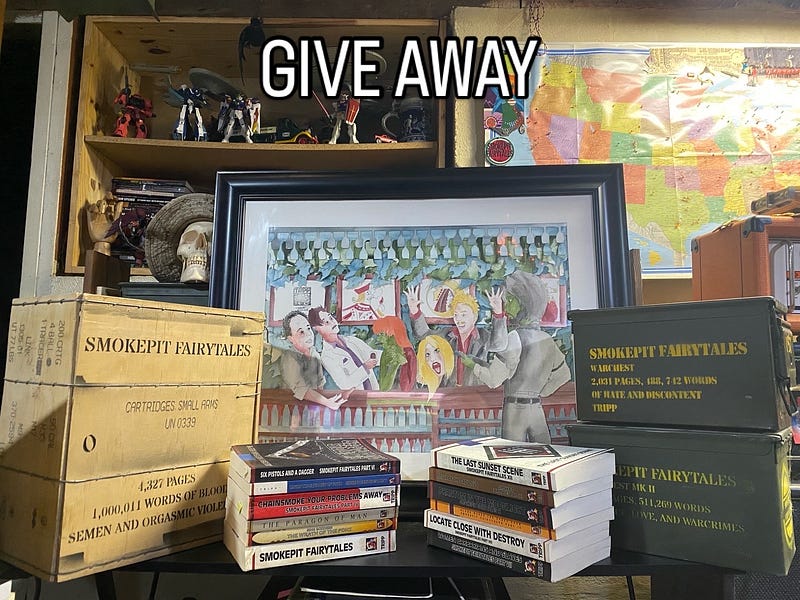 I made this painting a while back, ita a scene from my book Smokepit Fairytales. I painted all the characters and the scene and then cut them all out and assembled it together like so. It’s been hanging on my wall for years, I really do love it, BUT I’m redoing some modeling here soon and this watercolor is going into storage… unless someone gets a WarCrate TODAY, or I guess whoever orders one first... And that War Chest has all 12 Smokepit Fairytales books in custom painted ammo cans with stickers, cards, and patches, and that’s all wrapped up in a crate.