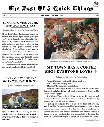 Amazing! Iโd read from Ruth Gaskovski about this nifty tool built from danielle (๐๐ถ๐ & ๐ป๐๐๐ถ๐) to turn a collection of Substack essays into a print โnewspaperโ, so I played around with good stuff Iโve recently shared in 5 Quick Things letters. Et voila! It easily generated a 20-page printable PDF for me to enjoy. (With examples from Shawn Smucker, Julie Kilcur and more.)