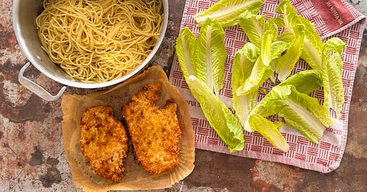 march 3 x 3: chicken cutlets, spaghetti + romaine lettuce