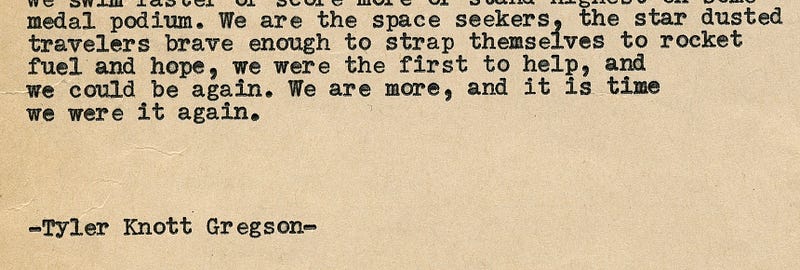 Sobbed watching our astronauts come back home. This is what humanity is. Can be. Should be. This is what we need to find again. Thought of these final lines of Typewriter Series #1316 I wrote years ago.