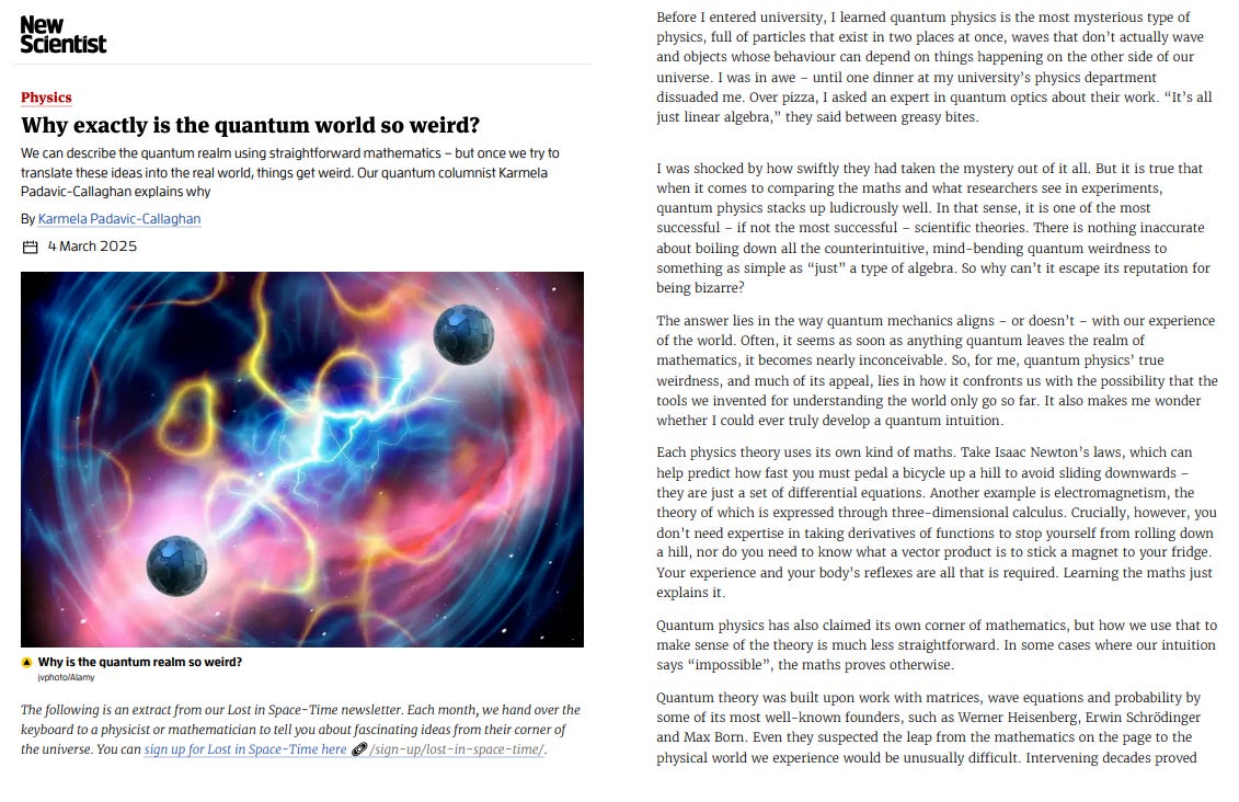 I’ve got a new monthly column in New Scientist, about all things quantum, and for its inaugural issue I wrote about what the reputation that quantum physics gets for being bizarre may have to do with its mathematical character. It’s rare for me to write in first person outside of Ultracold so writing this was a bit of a treat - and I’m excited to keep doing it.