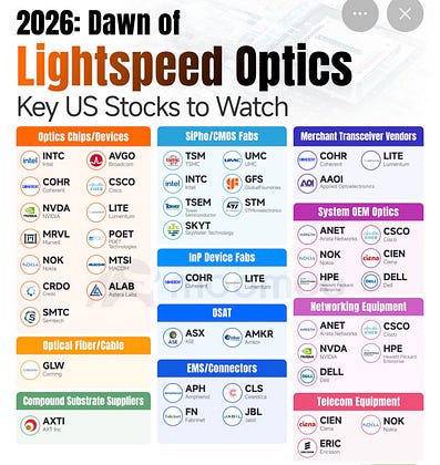 2026: Dawn of Lightspeed Optics,將美國光學與矽光子(Silicon Photonics)產業的關鍵公司分為以下十大類別: