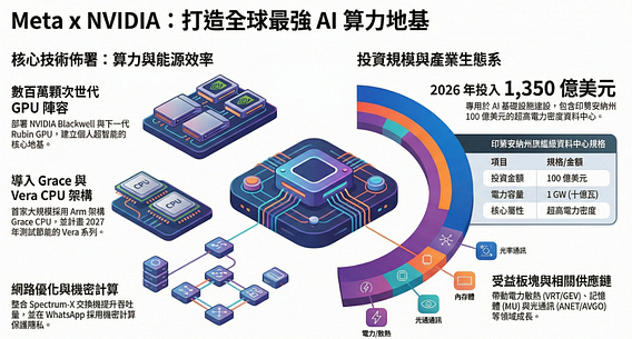 1. Meta 將在其超大規模數據中心部署數百萬顆 NVIDIA 的 Blackwell 以及下一代的 Rubin GPU。這筆交易被視為 Meta 實現「為全球數十億用戶提供個人超智能」的核心地基。