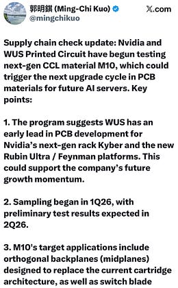 1. NVIDIA M10 材料升級:NVIDIA 下一代平台 (Rubin/Feynman) 將捨棄傳統架構,改採 M10 CCL 與正交背板,解決傳輸瓶頸。