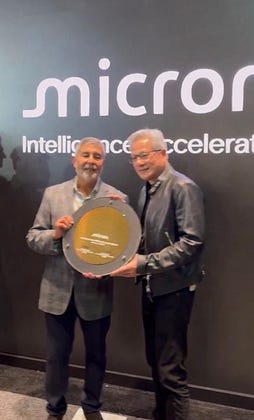 這塊盾牌很重要是因為 MU CEO很聰明,親自把HBM4(那塊盾牌)親自交到老黃的手上,證明他們也有交HBM4給輝達。