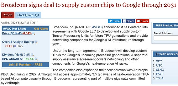 #AVGO 博通公司與GOOGLE簽署協議 ,將向Google供應客製化晶片至2031年。