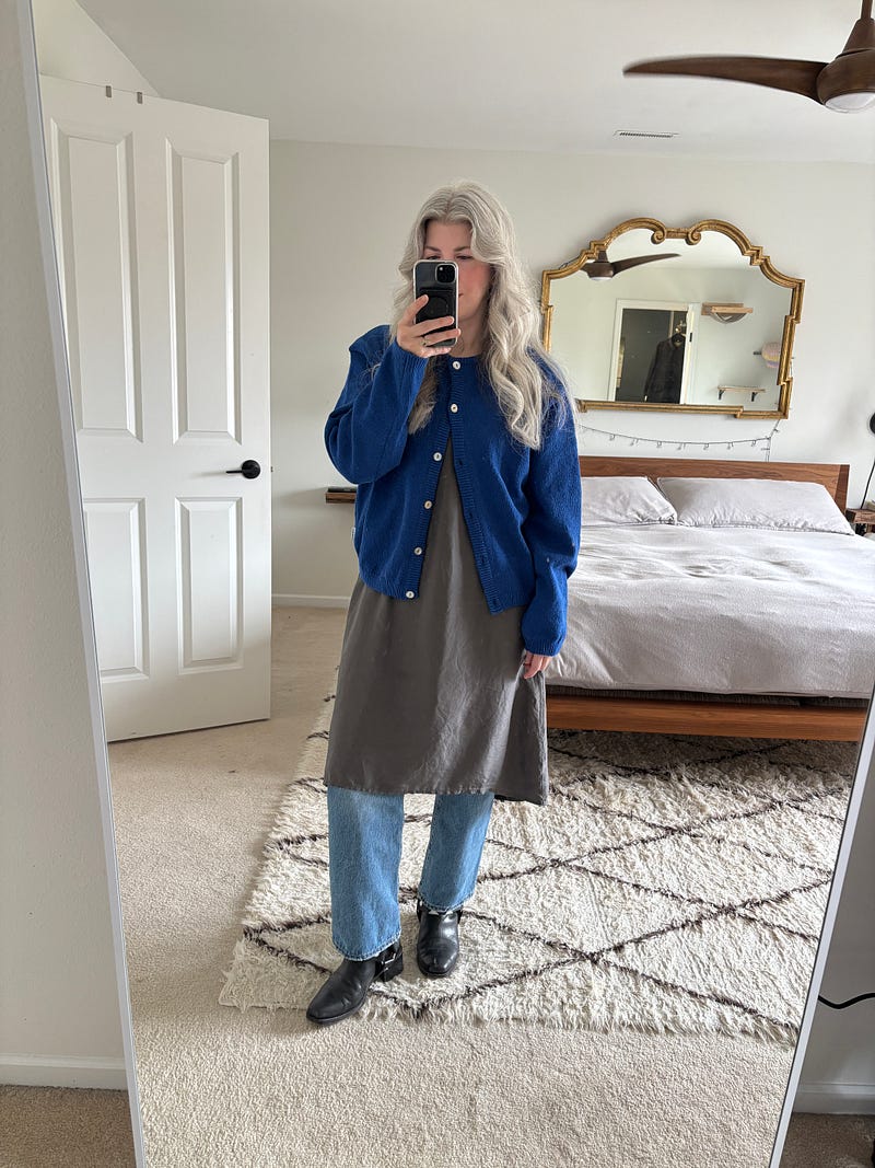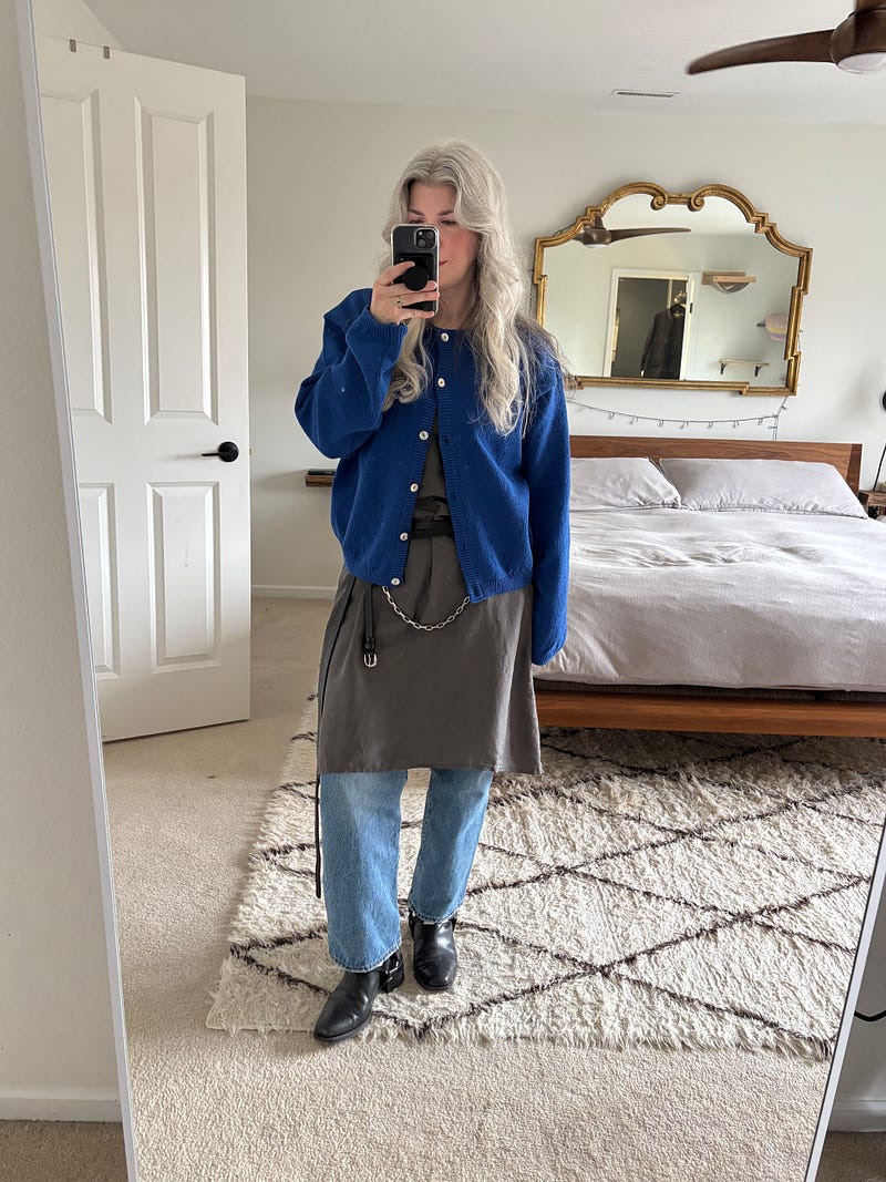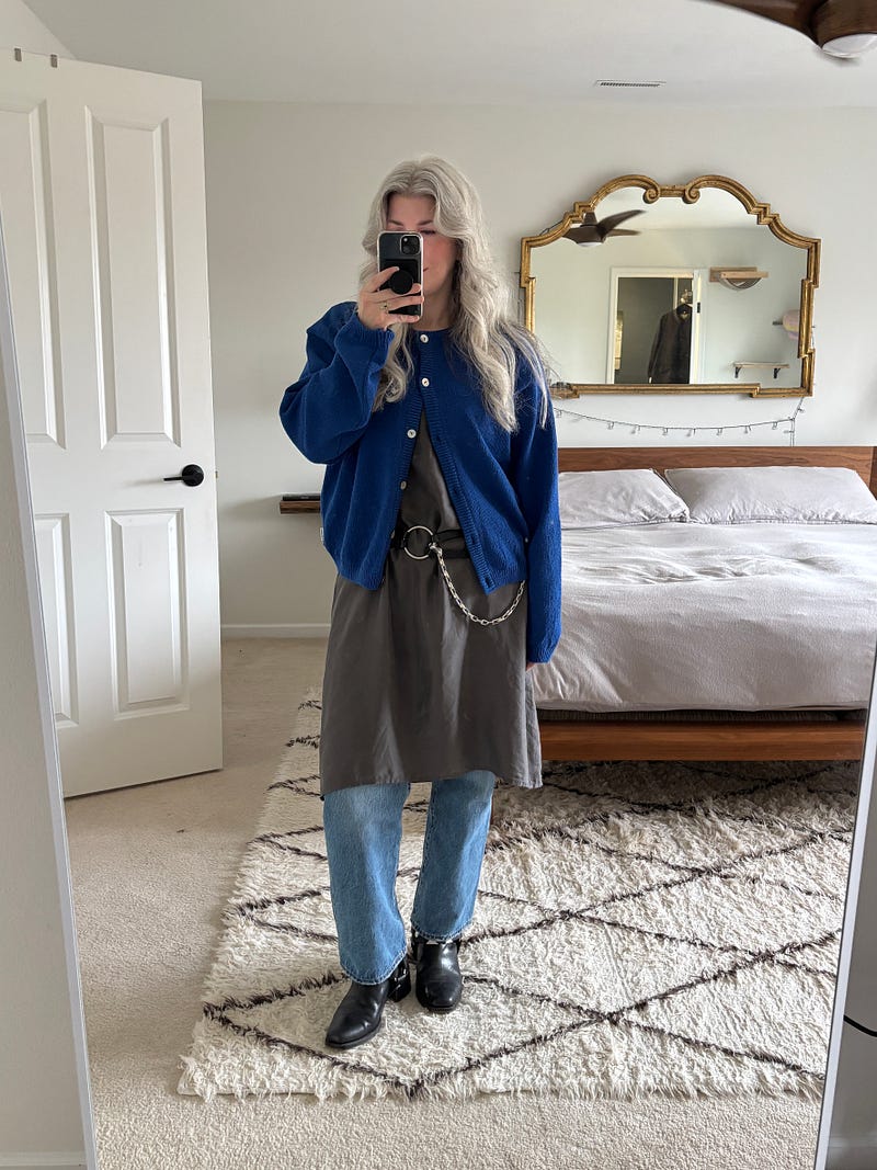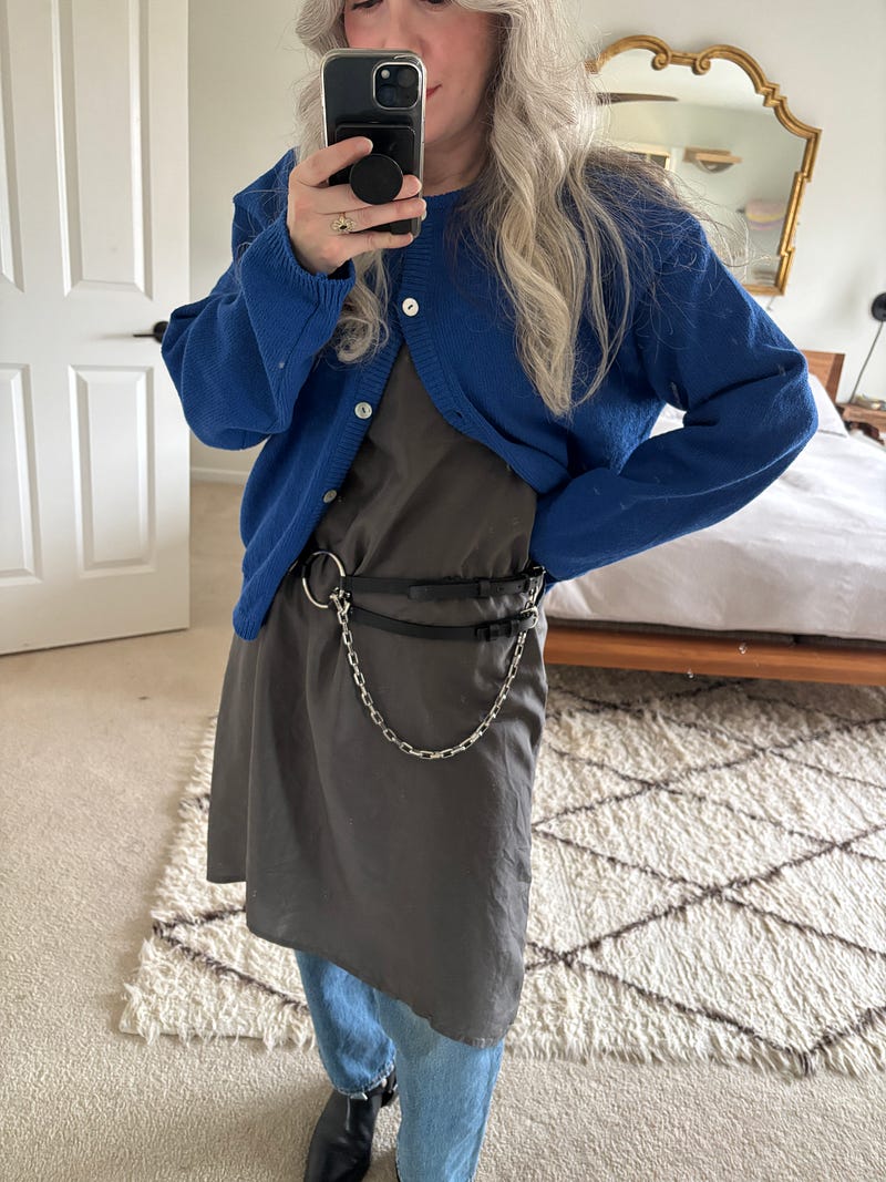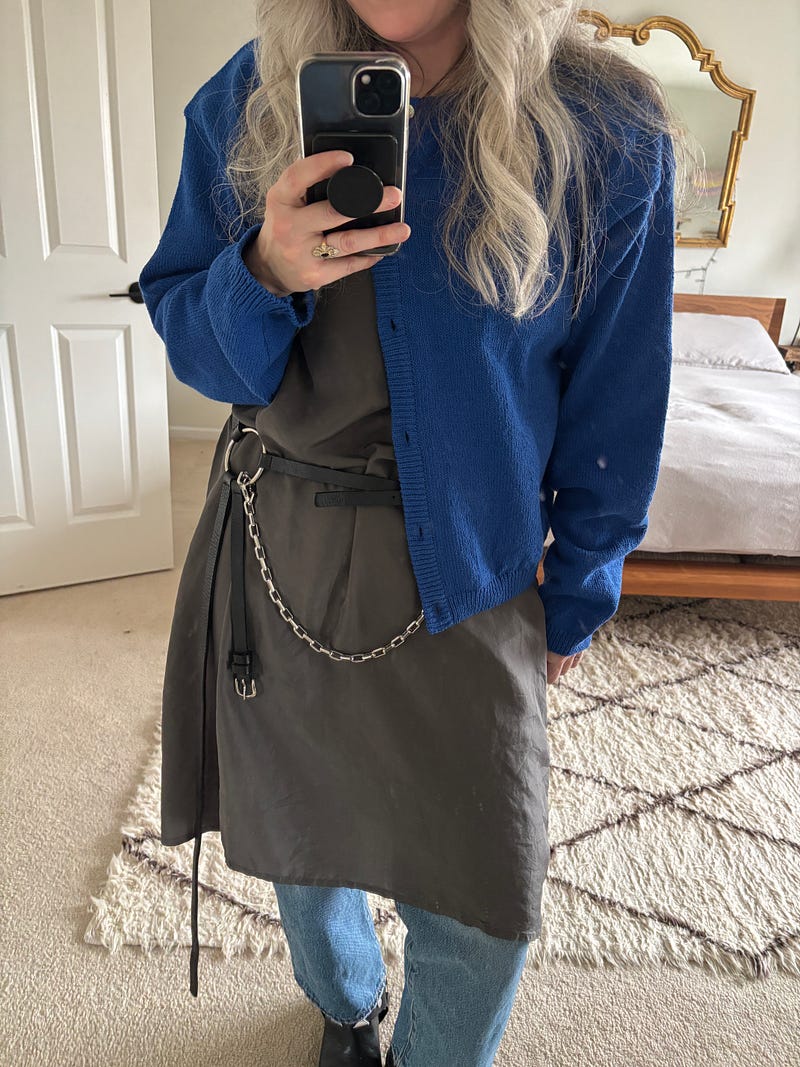 (1) First, over a dress over jeans. I brought the silver loop to the center of my waist so that it was visible under the cardigan.