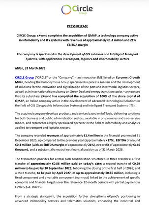 Circle Group $CIRC.MI announced that it’s subsidiary exyond acquired 100% of QMAP, an Italian company active in the development of advanced technological solutions in the field of GIS (Geographic Infomation Systems) and Intelligent Transport Systems (ITS).