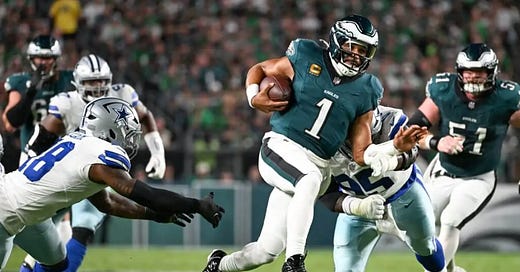 Jalen Hurts turned 10 dropbacks into scrambles, gaining a massive 66 yards and two touchdowns (+6.4 EPA)