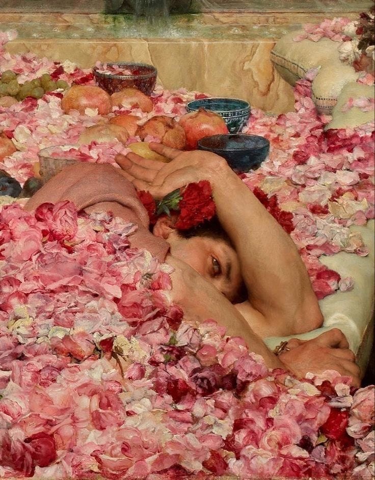 اقرب اللوحات الى قلبي؛ تذكرني بإقتباس "الجمال يمكن أن يكون قناعاً للشر والفساد…"، علما ان اللوحة بالرغم من جمالها الظاهري، تبدوا كلقطة من النعيم ولكنها تحمل معنى الموت بالترف، اختناق بالجمال والرغبة في آن واحد…،