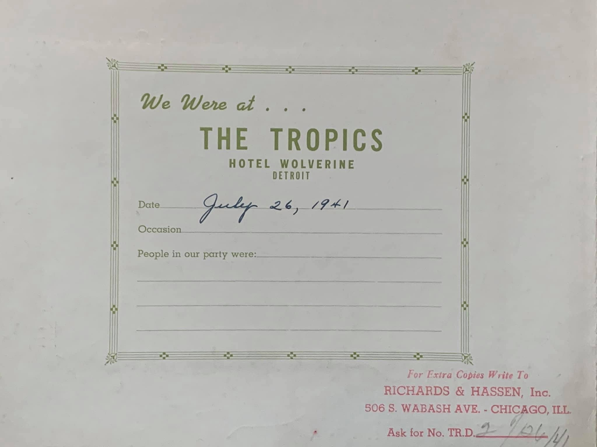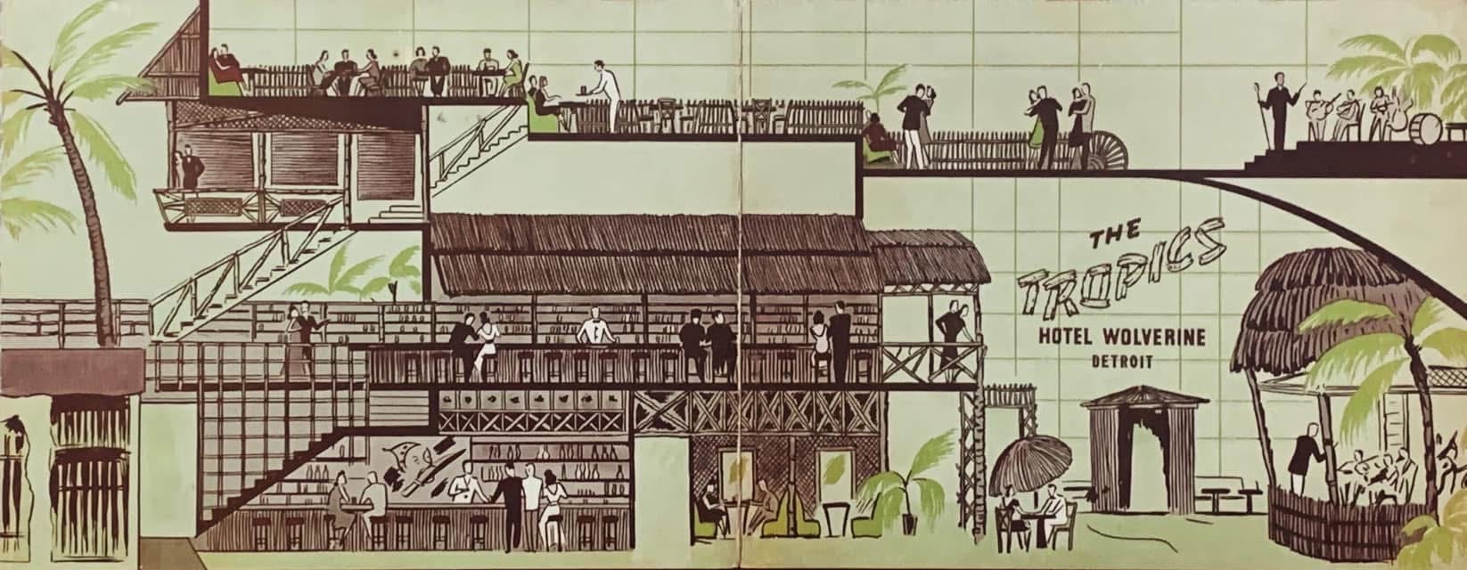 More than eight decades ago, when she was a few months shy of 17, my mother went on a date with her high-school beau to a hotel in Detroit that contained a tropical paradise — or, at least, a tropical paradise as it was seen by the American Midwest in 1941, on the eve of Pearl Harbor. I love the photo of her, resplendent in her white hat. I love his tie and long pointed collar. But most of all, I love the folder in which the photo came - a Modernist, panoramic rendition of "The Tropics," smack in the middle of the Hotel Wolverine, where the elaborate bar contained a waterfall, straw kiosks were everywhere and bands played on two separate levels. It must have been amazing.