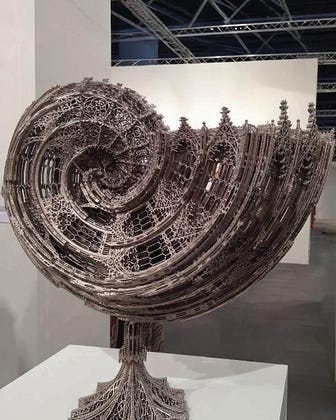 A nautilus shell reimagined as a Gothic cathedral. Laser-cut steel filigree, coiled into the shell's perfect spiral, merging the geometry of nature with the ornament of historical architecture.
