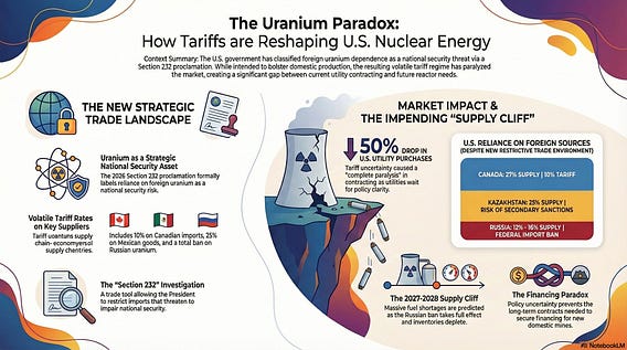 The U.S. government has classified foreign uranium dependence as a national security threat via a Section 232 proclamation. While intended to bolster domestic production, the resulting volatile tariff regime has paralyzed the market, creating a significant gap between current utility contracting and future reactor needs.