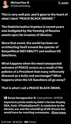 If the recent De-Dollarization initiatives were instigated by Russia's invasion of Ukraine and subsequent US Sanctions that resulted, what happens when PEACE breaks out and the impetus to flee the most liquid/elastic USD/UST ecosystem goes away?
