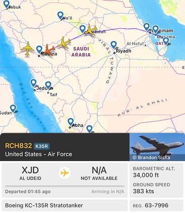 PER OSINT:Four KC-135R “Stratotanker” Aerial-Refueling Tankers have departed Al Udeid Air Base in Qatar within the last hour and are heading west across Saudi Arabia. This appears to likely be a rotation by the U.S. Air Force’s 434th Air Refueling Wing, with these KC-135s either heading to bases in Europe or returning to the United States.