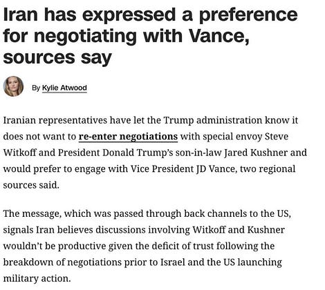 Iranian representatives have let the Trump administration know it does not want to negotiate with Witkoff and Kushner and would prefer to engage with Vice President JD Vance, according to two regional sources -CNN