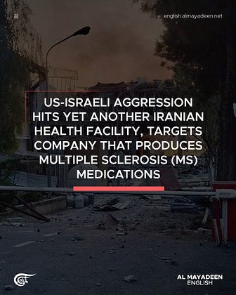 Iranian television reported that brutal US-Israeli aggression targeted an Iranian company producing multiple sclerosis (MS) medications, adding that this company is the only competitor to an Israeli pharmaceutical company in producing the raw material for multiple sclerosis (MS) medications worldwide.