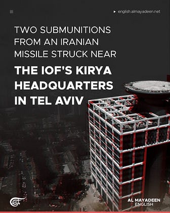 Israeli media reported that two submunitions from an Iranian missile struck in the vicinity of the IOF's Kirya headquarters in Tel Aviv.