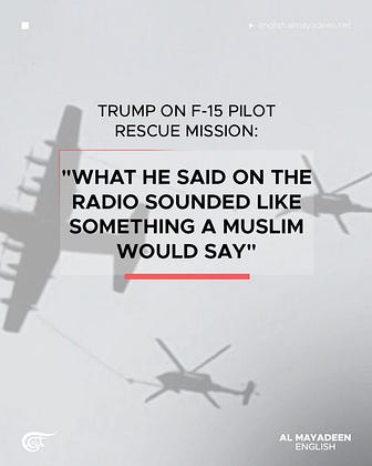 Trump said the weapons system officer gave a short, unusual message over his radio after ejecting from the aircraft. "He said: 'Power be to God.'"