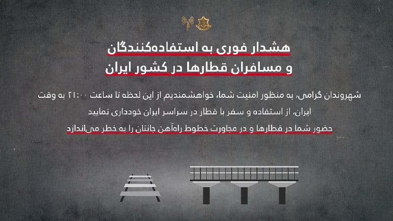 IDF:Urgent Warning to Users and Train Passengers in the Country of Iran.