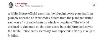 NEW: A White House official says that the 10-point peace plan that Iran publicly released on Wednesday differs from the plan that Trump said was a “workable basis on which to negotiate.” - NYT