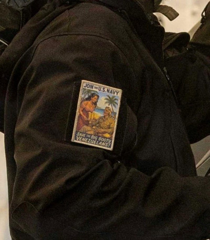 A photo of a U.S. Navy sailor aboard the aircraft carrier USS Gerald R. Ford wearing a patch reading “Join the U.S. Navy — Save the Big Booty Venezuelans!” briefly appeared on the Pentagon’s official DVIDS platform before being deleted.