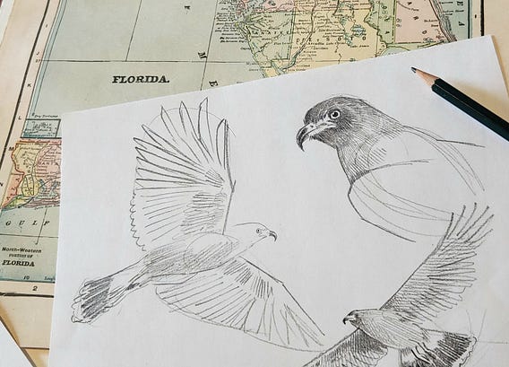It is always a special treat when I am commissioned to draw a bird with which I am not familiar. Before settling on the final drawing, I have the pleasure of spending time with my new subject to get acquainted with their unique shapes and proportions. This week it’s the snail kite, a glorious devourer of apple snails in the Everglades, who will soon fly across this original 1893 Florida map.