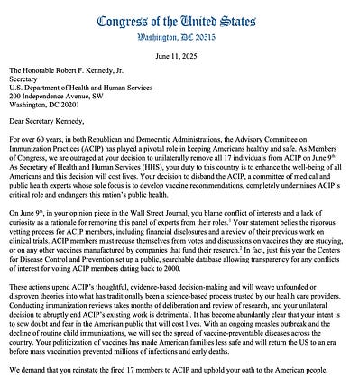 I join Congresswoman Schrier in demanding that Secretary RFK Jr immediately reinstate all members of the Advisory Committee on Immunization Practices (ACIP)!