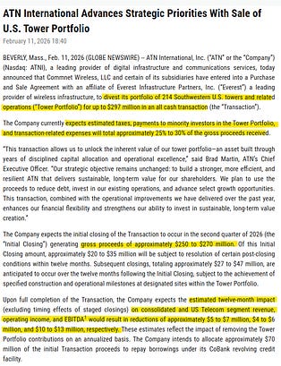 ATN International (ATNI) announces divestiture of their US tower portfolio for $250-270m gross proceeds ($180-195m net)