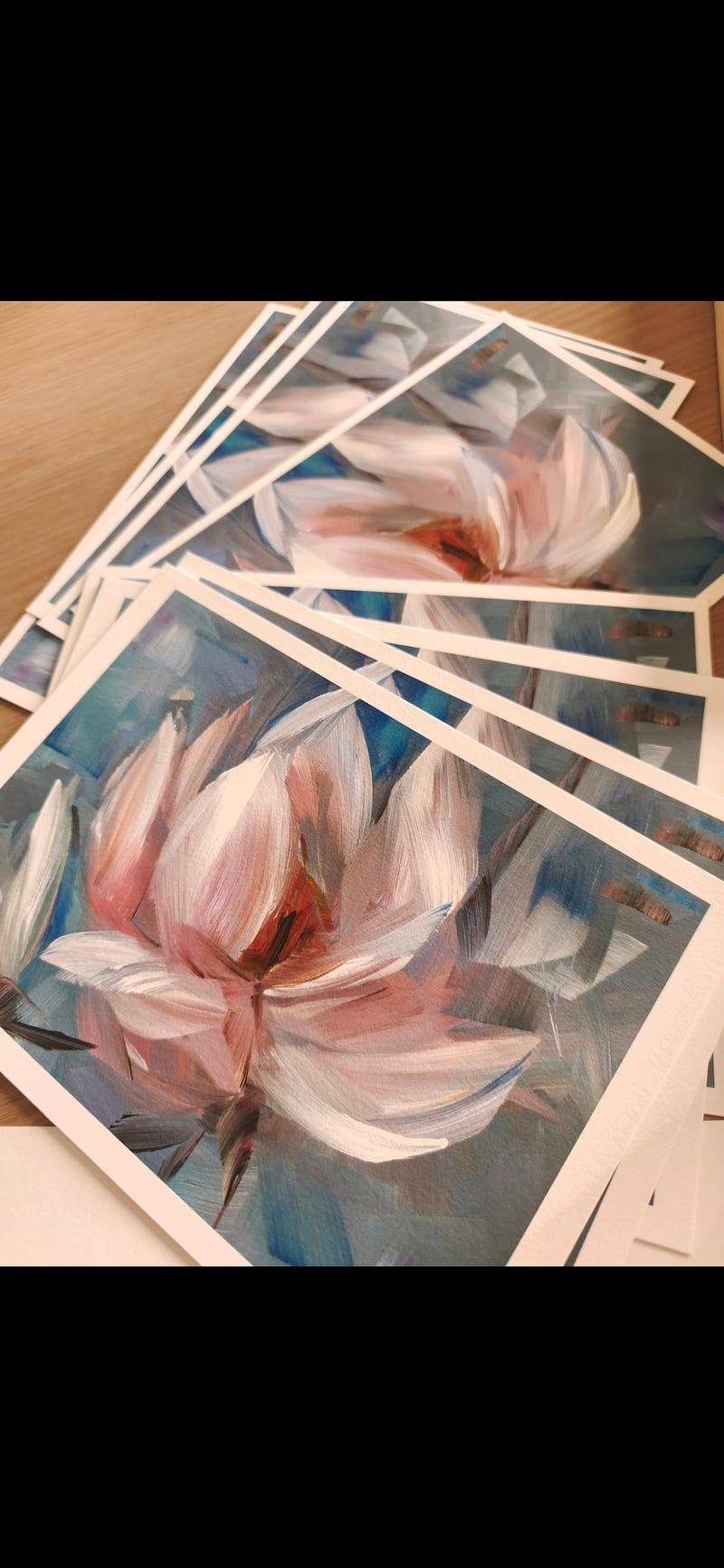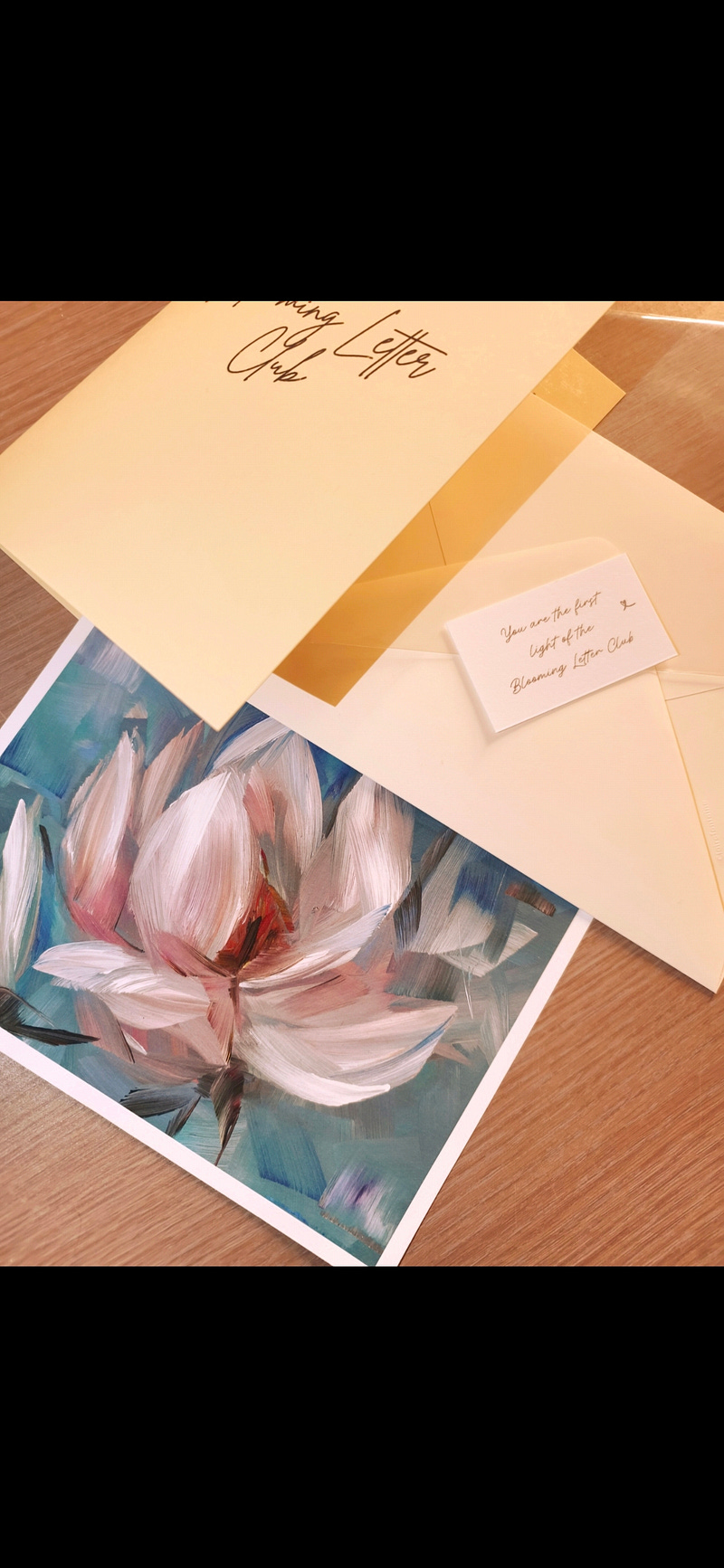 A small signed floral fine art print (≈A5 size, about 15 × 21 cm / 6 × 8″), with a studio note, mailed each month.