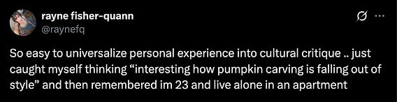 One of the best tweets of all time. Nearly every day I see an online essay that is basically reflecting on the decline of pumpkin-carving.