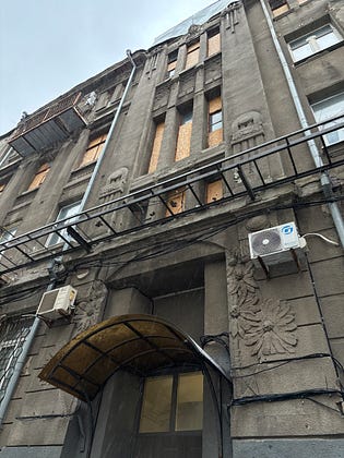 A Moderne style house in Kharkiv. Flowers are a very typical decoration in Ukrainian architecture. Even inspired by the northern moderne style of the early 20th century, elements of the surrounding nature, richness of gardens are displayed in these subtle elements. Unfortunately, touched by russian missiles.