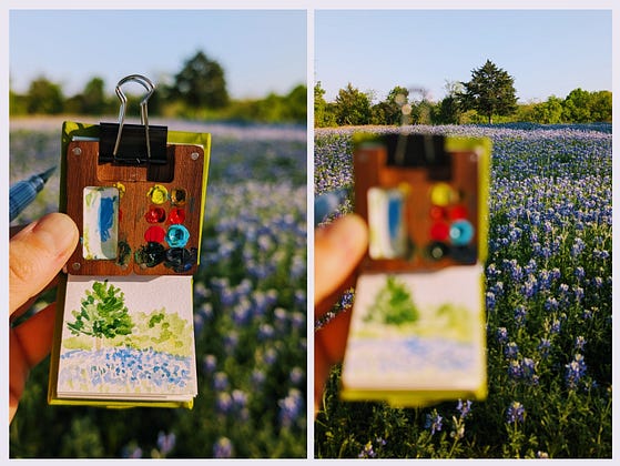 A tiny watercolor sketch while exploring local Bluebonnet fields with my friend.