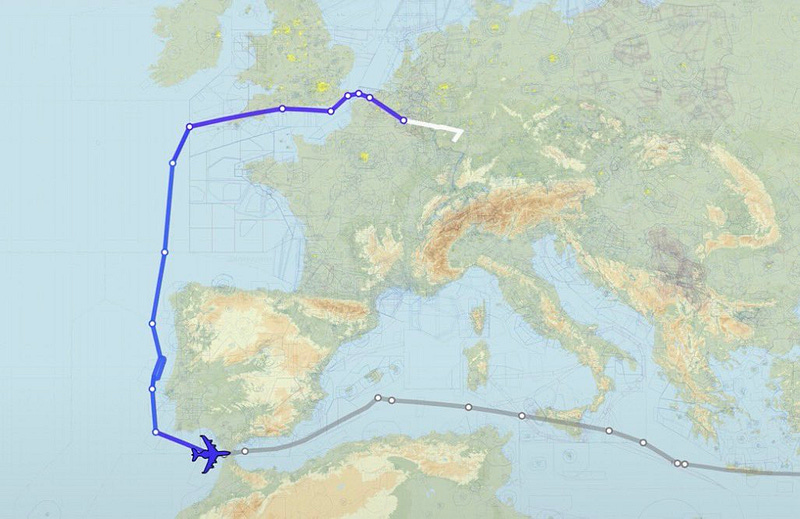 ​This photo, showing a complex, multi-waypoint flight path, perfectly encompasses the strategic friction in the NATO-U.S. relationship today. The U.S. military aircraft (indicated by the blue icon at the start) is taking a massive, resource-intensive detour over the Atlantic and Mediterranean, explicitly circumventing the airspace of core NATO allies such as Portugal, Spain, and France.