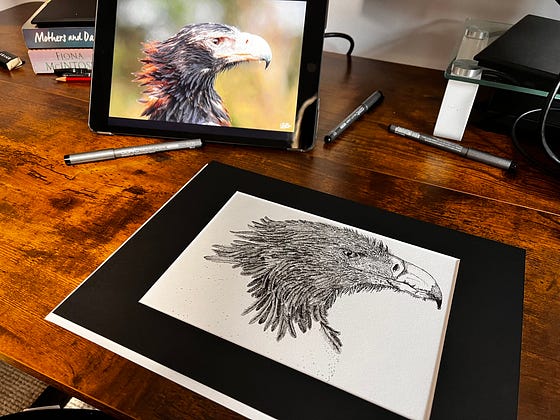 Yesterday was tough but I sought out things I love, the sand, the water, the dogs, the ponies, the sunset, family, friends. I reminded myself it was hard, but I have done much harder things. Today was tricky, but in the end the eagles delivered. This is why I draw birds…