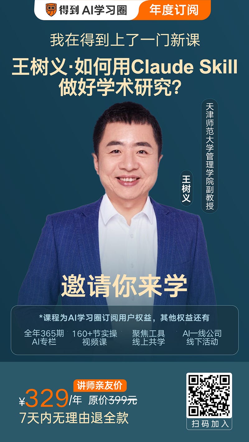 我在得到的第二门课程正式上线,讲解如何用 Claude Skill 辅助科研。得到 AI 学习圈还有很多其他优质课程,用我的邀请二维码加入,可以省 70 元畅学一年。欢迎你跟我一起来得到,学用 AI 😄🤝