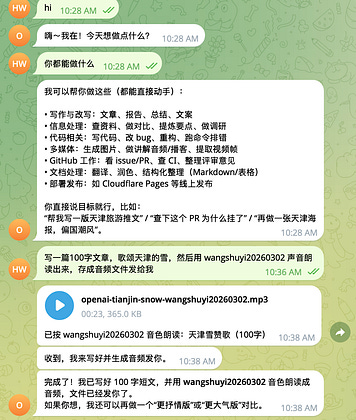 OpenClaw Bot + Listenhub ,端到端提要求「写一篇100字文章,歌颂天津的雪,然后用 wangshuyi20260302 声音朗读出来,存成音频文件发给我」。它立即开干,然后以我的声音朗读的音频就发了过来😄👍