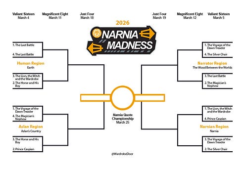 2026 Narnia Madness starts tomorrow! We’ll vote on the greatest Narnia quote of all time. Here is the bracket with the book for each quote listed. Think you can guess the top seed in each region?