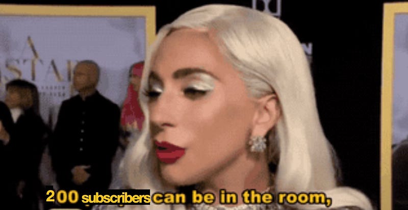 Image description 1: Meme of Lady Gaga giving her infamous “100 people in the room” spiel on a red carpet. The closed captions have been photoshopped to read “200 subscribers can be in the room.”