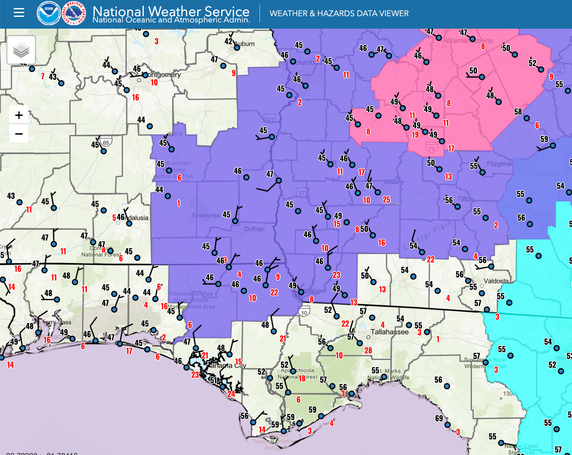 Rainfall is kicking up along the Gulf Coast tonight, as a combination of an Arctic front and weak Gulf low looks to probably change that cold rain over to a few hours of mixed rain and snow or wet snow Sunday morning in northwestern portions of the Florida Panhandle, far SE Alabama, and south Georgia. A Winter Weather Advisory (in purple below) is in effect for Holmes, Washington, and Jackson (Marianna) Counties in Florida, as well as Dothan, Bainbridge, and Albany. These areas are likely to see a slushy coating to an inch of snow tomorrow morning between 5 and 11 a.m. Eastern, with 1-3" of snow possible north of Albany towards Macon in Central Georgia, where Winter Storm Warnings (pink) are in effect.