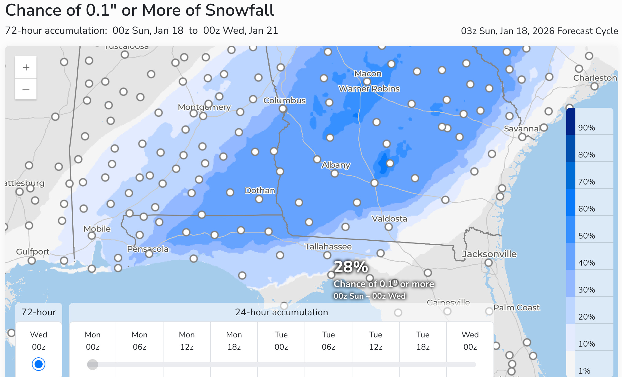 South of I-10 and east of the Apalachicola River in Florida, you are looking at a New Jersey-esque cold rain, with any snow brief and short-lived. However, there does remain a slight chance of a trace to coating of snow for Pensacola, Destin, Panama City, and even Tallahassee. The official National Weather Service forecast gives all of these areas a 20-30% chance of a trace of snow, which if it happens would be unlikely to stick. If a few minutes of snow do happen in Tallahassee, it would likely be between 9 a.m. and noon.