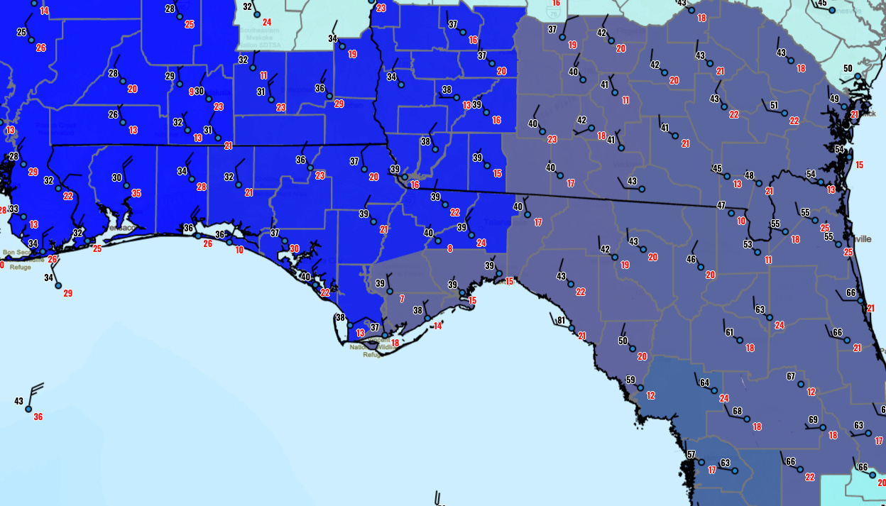 After a brief reprieve, winter is back in Extreme Northern Florida, where temps will struggle into the 40s this afternoon ahead of a bitterly cold and breezy night with lows in the lower 20s. The National Weather Service has issued the rarely-seen Extreme Cold Warning for the overnight hours into Tuesday morning (along with Freeze Warnings) for the areas in royal blue, including Tallahassee. Extreme Cold Warnings are issued for the Panhandle when the wind chill is expected to be 15F or below, so bundle up tomorrow morning. Areas south and east of Tallahassee are under Cold Weather Advisories and Freeze Warnings.